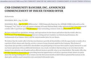 CNB Community Bancorp - $CNBB odd lot tender offer - tender deadline 25 September 2024